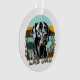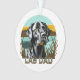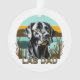 Christmas ornament. AI art watercolor black lab with a vintage sunset with retro colors teal and brown.