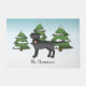 Destei's original cartoon illustration of a cute black coat color Labrador Retriever breed dog. The dog is placed in a winter scene with three green fir trees and falling snow. The background is a blue to white gradient giving the design that cold winter day look. There is also a personalizable text area for a name.