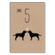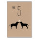 Black Labrador Retriever bride and groom silhouettes with heart. A kraft paper style wedding reception table card for Black Lab lovers. Each card must be numbered and added to cart separately. Visit Jenn's Doodle World for even more dog breed table cards and Labrador themed wedding planning products.