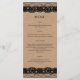 Beautifully illustrated black lace decorates this medium colored, burlap menu. It is printed on a rack card as a an affordable option.