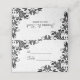 Elegant black floral lace swirls over white floral damask pattern