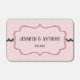 Create your own personalized wedding favors. This matchbox features your names and wedding date set inside an ornate frame with a black lace illustration accent against a soft pink background with a faux quilted pattern.