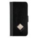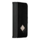Modern upscale masculine looking iPhone wallet case on a solid black leather like texture background with a geometric cream champagne shiny foil diamond shaped monogram. Personalize it with your monogram letter and name!