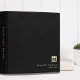 Modern recipe binder features a minimal luxury design with a brushed gold monogram on a black leather print background. Custom family name presented in the lower right hand corner in stylish simple font with a complimentary luxury monogram medallion.