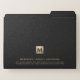 Modern monogram design with stylish brushed metallic gold monogram medallion with personalized company name, address and contact information below on a black leather look textured background. Personalize for your custom use.