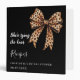Black bacground. Decorated with a large leopard printed bow. Text: She's tying the knot.