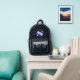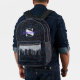 This custom printed backpack features a black licorice rainbow glitter background, with holographic iridescent silver glitter dripping from the front zip pocket, The template allows for easy personalization, including a large monogram initial and / or a full name in a neon purple calligraphy script font. Either can be easily eliminated by simply leaving the custom text box blank.