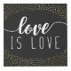 Photo cube with room for four of your wedding photos, with love is love written on a black background decorated with faux gold confetti.
