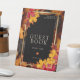 Create a captivating focal point at your wedding reception with our exquisite guest book pedestal sign. This stunning design features a rustic backdrop of autumn leaves, complemented by a shorter, black panel adorned with a shimmering gold frame and surrounded by autumn foliage. The couple's names are elegantly displayed in the upper corner, adding a personalized touch.