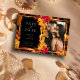 Step into a world of enchanting darkness and rustic charm with our exquisite save the date cards. This captivating design features a rustic backdrop of autumn leaves, complemented by two elegant gold frames placed horizontally. The black background of one frame provides a striking contrast to the gold, while the other frame is perfect for showcasing your beloved couple's photo.