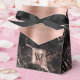 An elegant favor box featuring a black marble background with rose gold highlights and a faux rose gold brushed metal flap fastened with a black ribbon. Personalize it with your initial in black on a double-bordered faux rose gold brushed metal square.