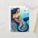 This postcard features artwork of a brown-skinned mermaid with long blue and purple hair and fish tail posing in an underwater scene with fish, seaweed, and coral. Her eyes are closed as she serves fierce fish! Ocean-core aesthetic with a pretty black girl.