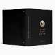 Modern recipe binder features a brushed gold metallic monogram on a rich black background. Custom family name presented in the center in stylish simple classic block typography with a complimentary metallic gold monogram medallion.