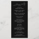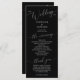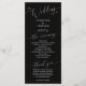 Minimal wedding program featuring modern script font on a black background. All the wedding ceremony information and the wedding party's name listed on this program.