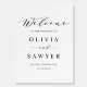 Welcome guests to your event with this customizable wedding welcome sign. It features black minimalist script and simple typography. Personalize by adding your details. This calligraphy wedding welcome sign is perfect for any wedding theme and season.