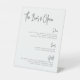 Display your wedding or event bar menu selections in modern style with this simple and elegant pedestal sign featuring soft black lettering on a crisp white background. "The Bar is Open" or your custom header appears at the top in modern handwritten script lettering. Personalize with your bar menu items beneath, aligned at the right, with three headers for beer, wine, and spirits -- or your choice of text.