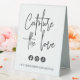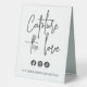 Share your wedding hashtag with guests with this cute table tent sign. Place one near the entrance to your reception, or on each table. Design features "Capture the love" in modern handwritten script lettering, with three social media icons beneath, and a template field for your wedding hashtag. Colorway: Ash, a soft black.