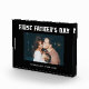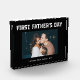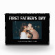This modern black and white Father's Day photo block for the first time dad features a simple, dark black background with masculine white script typography that says "First Father's Day." Add a photo of him and the baby, with room to personalize with names and year.