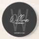 This design features personalized groomsman's name in white modern handwriting script font style and monogram in grey modern sans serif font style as background, with wedding details in white modern sans serif font style, on black background.