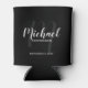 This can cooler features personalized groomsmen's name in white modern script font style and monogram in light grey modern script font style as background with title and wedding date in grey modern sans serif font style on black background.