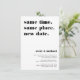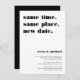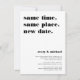 Need to postpone or reschedule your wedding? Let guests know with these modern and lighthearted cards in white with black lettering. Funny and clever typography-based design features "same time, same place, new date" at the top with your new wedding date and details beneath.