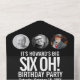 Bold simple mono graphic black and white photo template all-in-one 60th birthday party invitation. Personalize this detachable milestone birthday invitation with your own birthday party event details, and up to six different photos of the birthday boy or girl. Invite comes with a simple RSVP detachable reply card where you can also request a song to dance to or ask for any dietary or special requirements if required. Simple three photo circles for your now and then photos from the past 60 years. Other colors and matching items are available. © Original design by Sarah Trett for www.mylittleeden.com on Zazzle.