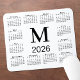 Minimal calendar mouse pad features a black 2026 calendar on a white background with a bold black custom monogram above the year in the middle. Add your initial in the sidebar.