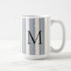 A personalized mug has a bold black monogram over slate gray and off white vertical stripes, this design has will look great with both contemporary and vintage style decor.