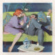 Artist: Lynn Buckham | A woman in a purple dress and a man in suit sitting on a green couch.
