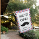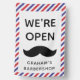 Open for business flag for a barbershop with red, white, and blue stripes and a big mustache. Personalize with your business name.