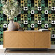 This design showcases a modern geometric pattern with circles and half-circles in shades of white, ochre, mustard brown, teal green, and beige against a black backdrop. It's an elegant and stylish design that embodies eclectic minimalism, perfect for artistic interior designers, decor enthusiasts, trendsetters, and fans of vintage retro or abstract digital geometric motifs. This ornate yet funky hipster pattern is versatile, available on a variety of contemporary home decor items, making it suitable for enhancing the ambiance of spaces such as master's bedrooms, kitchens, living rooms, man caves, college dorms, condos, studios, or apartments.