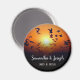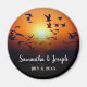 Create your own save the date or anniversary magnet. A black ombre with a photo of a flock of gulls silhouetted against a bright orange sunset. The bride and groom's names are in a white calligraphy font. Sunset cruise wedding. Seaside, beach, oceanside or lakeside wedding venue. Great magnets for a tropical wedding destination. Black ombre or gradient round or square refrigerator magnets. Add your own photo to create your own wedding favors or save the date. Check out the vintage photo filter options in the system.