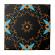 This ceramic tile features a symmetrical pattern that is both complex and visually striking. The background color is black which provides a stark contrast to the vibrant motifs adorning the surface. The design is composed of intricate floral motifs in vibrant shades of orange and blue, outlined with delicate golden lines. These motifs are symmetrically arranged, creating a harmonious balance that is pleasing to the eye. At the center of the tile is a star-shaped figure, surrounded by larger floral designs at each corner. Small blue dots are scattered throughout the design, adding depth and complexity to the overall pattern.