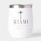 Welcome friends to your bachelorette weekend with these cute personalized bachelorette party wine tumblers. Perfect for beachy or tropical locales, this design features a black palm tree silhouette illustration with your destination beneath (shown with Miami) in classic serif lettering. Add your name(s) or occasion name beneath in handwritten cursive script, as well as the year.