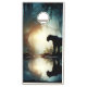 Awesome image of a black jungle cat walking along waters edge. Enough light shines trough the mossy trees to allow the reflection of his entire sleek black body.