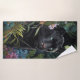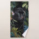 The image shows a striking black panther in the jungle, with its penetrating blue eyes staring at you. The lush foliage and vibrant flowers that surround the panther create a striking contrast with its elegant black coat.