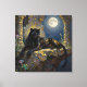 A black panther themed wall art. On the front is an illustration of a majestic black panther with fur like molten black and gold, laying on a cliff ledge bathed in ethereal moonlight. Intricate carvings adorn crumbling stone pillars, and bioluminescent flora casts a soft, otherworldly glow. The scene is rendered in a rich, textural oil painting style with thick, .