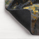 A black panther themed mouse pad. On the front is an illustration of a majestic black panther with fur like molten black and gold, laying on a cliff ledge bathed in ethereal moonlight. Intricate carvings adorn crumbling stone pillars, and bioluminescent flora casts a soft, otherworldly glow. The scene is rendered in a rich, textural oil painting style with thick, .