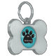 A sweet black paw print on a aqua animal pattern background, customize this pet tag with pets name and number to call if they get lost.