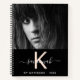 A chic black background. Personalize and add your own photo, a name, monogram letter and a year. The name is written in white with a large modern hand lettered style script with swashes. Peach colored monogram letter. For school, work as a sketchbook, diary and journaling. To keep the swashes only delete the sample name, leave the spaces or emoji's in front and after the name