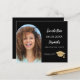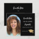 On front: Add your own vertical size photo of the graduate. Photo arch frame. A classic black background, white text. Templates for a name and date. The name and the text: Save the Date are written with a modern hand lettered style script. With a cap, tassel topper.