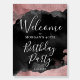 Welcome guests in chic style with this vertical birthday party sign featuring a distressed black background, soft pink accents, and crisp white fonts. A double white line frame adds a clean, refined touch, while rose gold foil-style detailing runs along the top and bottom edges for a modern, feminine twist. Please note: the rose gold foil is a printed image and will not have any actual shine or metallic texture.