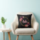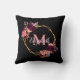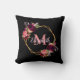 A faux gold geometric frame decorated with watercolored flowers, roses in burgundy and pink and boho style feathers. A chic black colored background. Templates for Your name and monogram letter. The name in pink is written with a modern and trendy hand lettered style script. The monogram letter in coral.