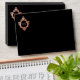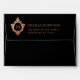 An elegant black and pink envelope with a monogram initial in a vintage crest on all sides. It is black outside and (faux) rose gold inside. The vintage crest is also rose gold. The return address is printed on the flap, in pink caps, with the monogram in crest on its left.