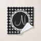 Black dots in close quarters create a secondary pattern of white stars. A large black circle is surrounded by white lines, while a single white initial graces the center.