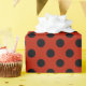 Black polka dots on red wrapping paper