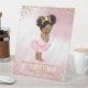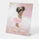 African American princess baby shower welcome table sign with adorable African American baby girl with cute afro puff hair wearing a pretty pink tutu and pearls on a pink satin and gold glitter background. This cute princess baby shower welcome sign is easily customized for your event by simply adding your details.
