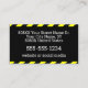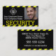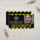 This business card features a professional design with a "SECURITY" title printed in bright yellow across the bottom portion over a black background. A sample security guard photo is placed on the right which you can personalize to include your own photo ID. A sample company or business logo is placed on the left, followed by an employee and company name. The security company or firm information and contact info is placed on the back. A bright yellow and black striped caution strip borders the top and bottom portions.