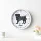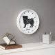 Destei's original cartoon illustration of an adorable black coat color Pug breed dog. The dog is standing and looking toward the viewer. The tail is curled on the top of the dog's back. The dog's mouth is closed and the eye color is brown. The clock face is made of simple modern lines. There is also a personalizable text area for a name or other custom text.