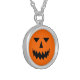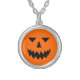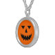 Black on orange pumpkin lantern face with triangle eyes and nose and a scary smile.